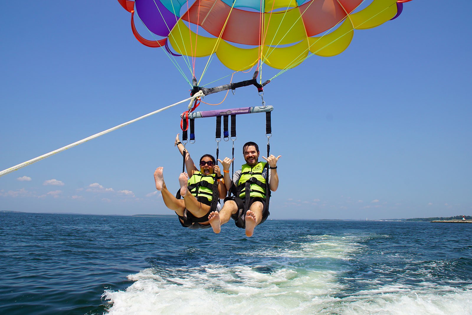 Our tandem ride with them was even more awesome then we expected! They offer three experience “tiers” depending on how high you want to go: a 600-foot line, 800-foot line, and 1,000-foot line. But, if you’re going to do it, you might as well do it all the way. So, we opted for the “top floor” 1,000-foot experience which allowed us to sail roughly 500 feet over the bay. That’s higher than the support structures of the Newport Bridge!