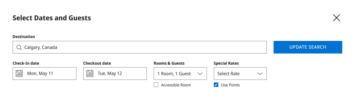 To redeem a Free Night Award, select “Use Points” in the search box when performing a search on the Hyatt.com website.